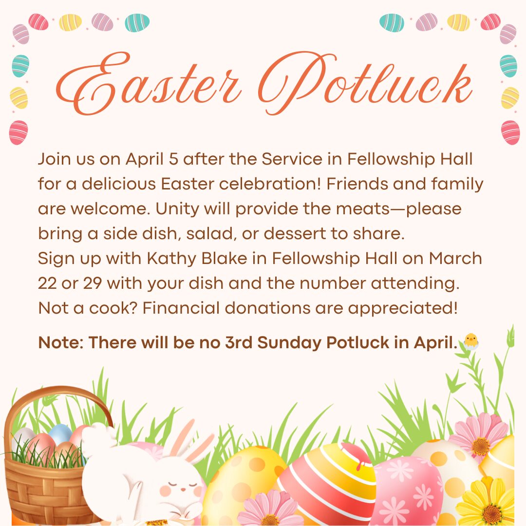 FeaturedUnity of Sarasota, 3023 Proctor Road, Sarasota, FL, 34231, United States Unity of Sarasota, 3023 Proctor Road, Sarasota, FL, 34231, United StatesPlease join us for a delicious Easter Sunday Potluck Luncheon on April 5, following the service in Fellowship Hall. Your friends and family are also invited to celebrate with us. Unity will be providing the meats, but you are encouraged to bring your favorite side-dish, salad, or dessert to share. Please sign-up with Kathy Blake…